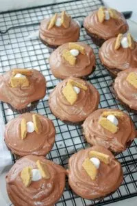 Now at this point you can use your favourite chocolate frosting to complete these S’mores Cupcakes.