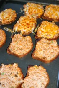 - Spread tuna mixture to edges of toast and place under the broiler for about 5 minutes or until just starting to brown, if you are adding the cheddar cheese.