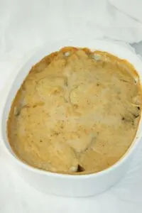 After I finished spreading the cream sauce it was time to bake the casserole in a preheated 375F oven.